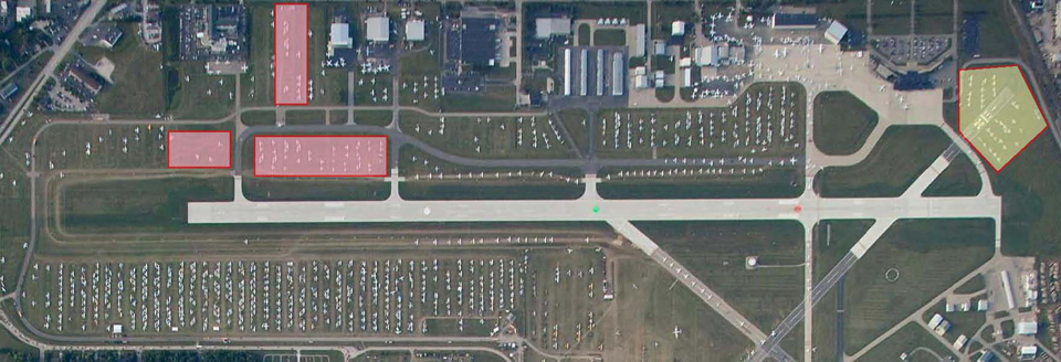 The North 40 Taxiway bravo construction will affect several area north of Runway 9/27. The areas shaded in red will not be available for aircraft parking in 2016. The area in yellow, at the end of Runway 5/23, is projected to completed by June 10 with continual monitoring as to its readiness to accept aircraft parking.