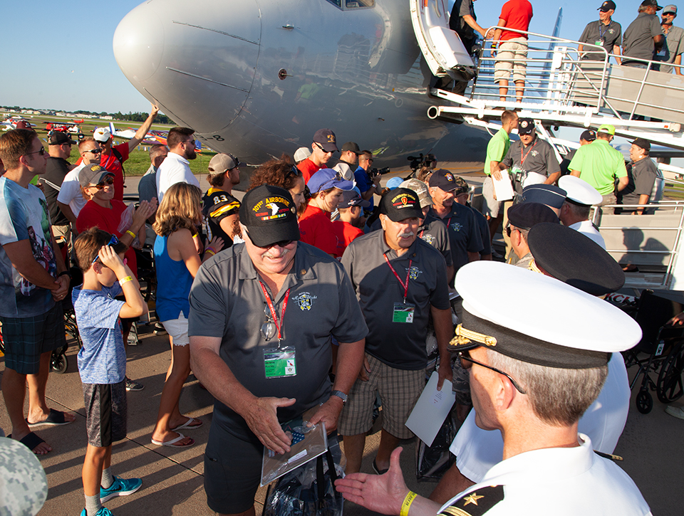 Following the afternoon airshow, the Yellow Ribbon Old Glory Honor Flight will return to Oshkosh after a day in Washington D.C. Sponsored by EAA, American Airlines, and Old Glory Honor Flight, over 100 Vietnam-era war veterans will have visited such memorial sites as the Vietnam Veterans Memorial Wall and Arlington National Cemetery that day. We encourage all AirVenture attendees to join in the Welcome Home Ceremony for these veterans at approximately 6:30 p.m. The return will be emotional for many, including the veterans and those welcoming them home. Now is your chance to welcome home the veterans who did not receive the honor upon their return from war.