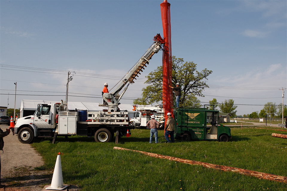 May 26, 2016 - Last weekend, the Communications Center “Green Gang” teamed up with volunteers from We Energies to pull, move, and relocate poles that will be part of an upgraded weather warning system on the AirVenture grounds.