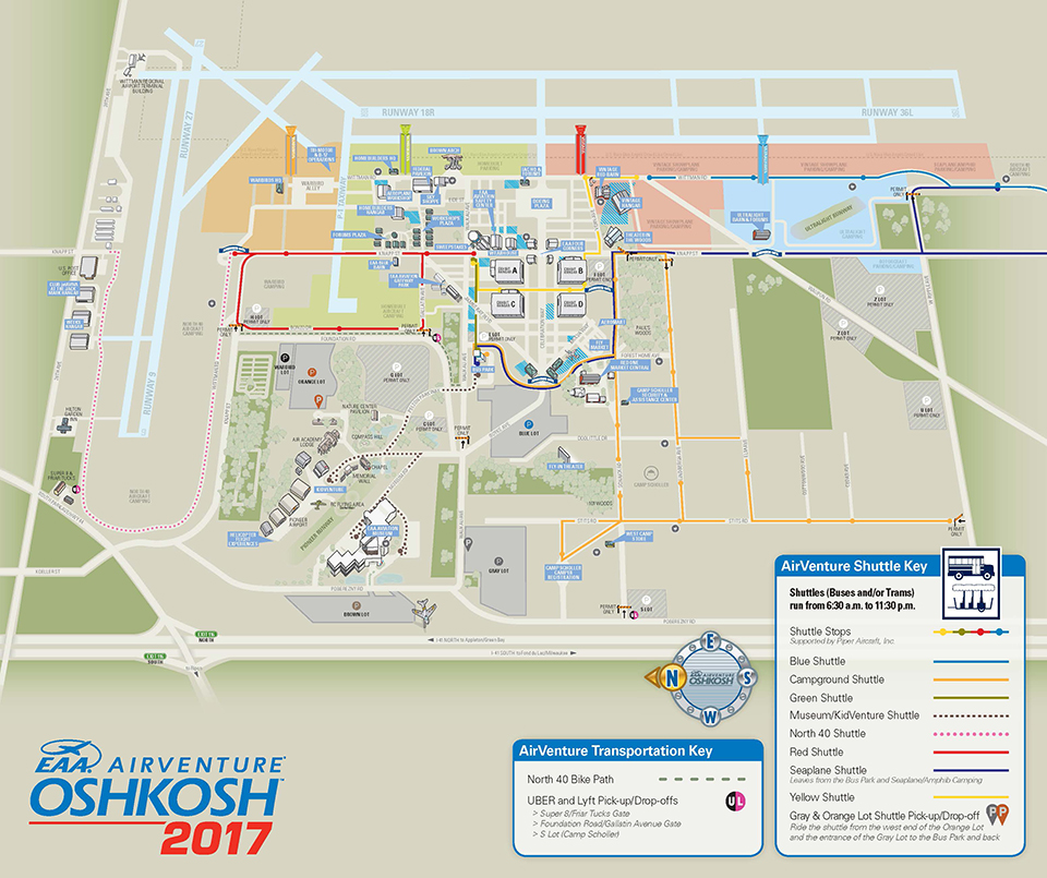 On the grounds, trams and buses will now be referred to as shuttles with new signs designating stops. The Yellow route running from Convention Headquarters to the Vintage area will also be reestablished and the Red route will be extended into Homebuilt camping. A new shuttle stop will be added on the Camp Scholler route near Gate 27. A new pedestrian path will allow visitors to walk through the F Lot to alleviate overcrowding in the area of the Camp Scholler East Gate.