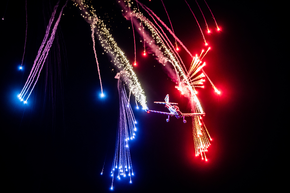 Evening (Night Air Show): Patriot Parachute Demo Team, USAF F-22 Demo Team, USAF Heritage Flight, Julie Clark (T-34 Mentor), Red Bull Air Force (MBB Bo 105 helicopter, wingsuits), Aeroshell Aerobatic Team (T-6 Texans), Randy Ball (MiG 17), Bob Carlton (SubSonex JSX-2), Patriot Parachute Demo Team, Gene Soucy (Firecat), Matt Younkin (Twin Beech 18), Nate Hammond (de Havilland Chipmunk), Twin Tigers (Yak-55), drone show, Redline Airshows (RV-8), Shockwave Jet Truck, fireworks by DTG Pyrotechnics & Special FX and wall of fire by Tora Bomb Squad