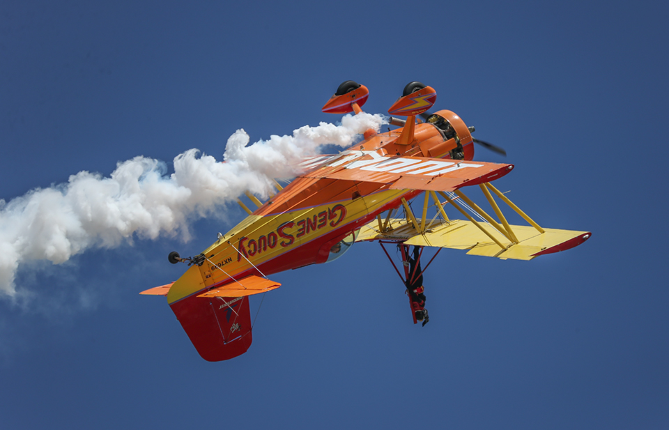 Day: Patriot Parachute Team, C-130, Sean D. Tucker (Oracle Challenger III) and Jessy Panzer (Oracle Extra 300L), John Klatt (Screamin' Sasquatch Jet Waco), Jeff Boerboon (Yak-110), Red Bull Air Force (Edge 540, MBB Bo 105 helicopter, wingsuits), Adventures of Aviore, Homebuilts Review, Kyle Fowler (Rutan Long-EZ), Warbirds of America show (trainers), Trojan Thunder (T-28 Trojans), Aerial Firefighting Demo, Kyle Franklin (Dracula), USAF Heritage Flight, USAF F-22/F-35/A-10 Demo Teams, Bill Barber Award Winner