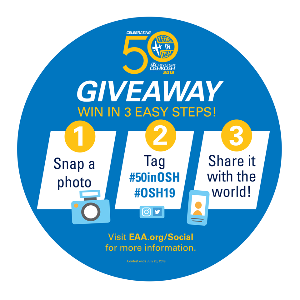July 18, 2019 - We are celebrating 50 years in Oshkosh this year at EAA AirVenture Oshkosh, and we want to spread the love! Snap a pic at one of the locations below, and then post your photos on Twitter or Instagram using #50inOSH and #OSH19. Each day during AirVenture, we will randomly select a photo taken at any of these locations using the hashtags listed. The winner can choose between a Bell helicopter ride or an EAA merchandise gift certificate. We might even throw in something special throughout the week! Submissions may also be shared throughout EAA's social media channels. Read more.