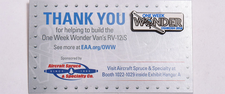AirVenture attendees will be able to participate in their own “hands-on” moment in the construction project by pulling a rivet on the actual airplane and receiving a One Week Wonder pin provided Aircraft Spruce & Specialty. Volunteers will capture the moment with a photo, and every person who pulls a rivet will get his or her name permanently included in the airplane’s paint scheme.