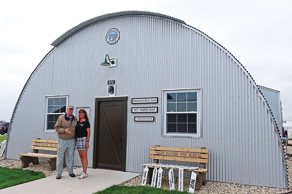 New to the Warbirds area this year is a Quonset hut beside the Warbirds in Review ramp. The gift of Ron and Diane Fagen of the Fagen Fighters WWII Museum, the tin building’s exterior is a dead-ringer for a World War II briefing building with period signage and landscaping, down to a line of white, painted rocks that GIs would have been tasked to keep bright.