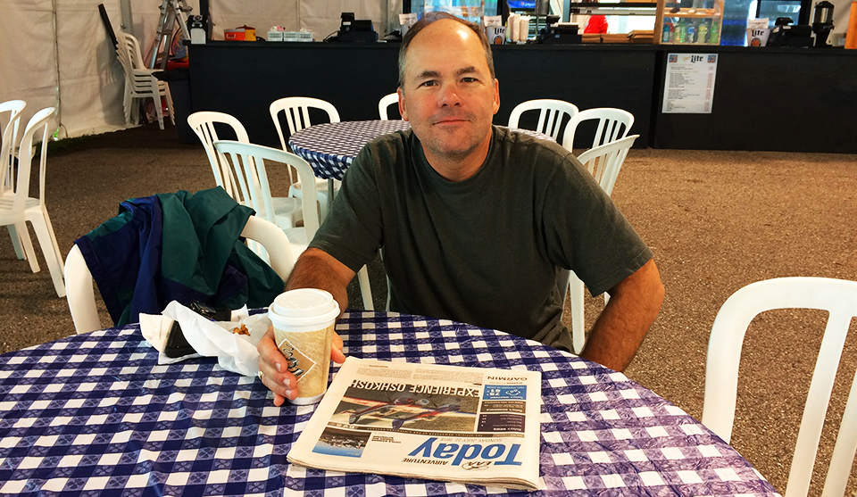 Bryan Jones, EAA 554776, from Houston was reading a copy of AirVenture Today with his morning coffee at the Waypoint Café. “This cool, soggy weather is very relaxing,” he said. “The only problem is my feet are wet. Other than that, I’m just dandy.” Bryan, who’s been to the fly-in, “eight or 10 times,” arrived in his RV-8. Built 18 years ago, it’s “right at 2,000 hours,” he said. He’s meeting up with friends here, and “We just work around” the weather, Bryan added. “We’ll just self-generate our own fun.”