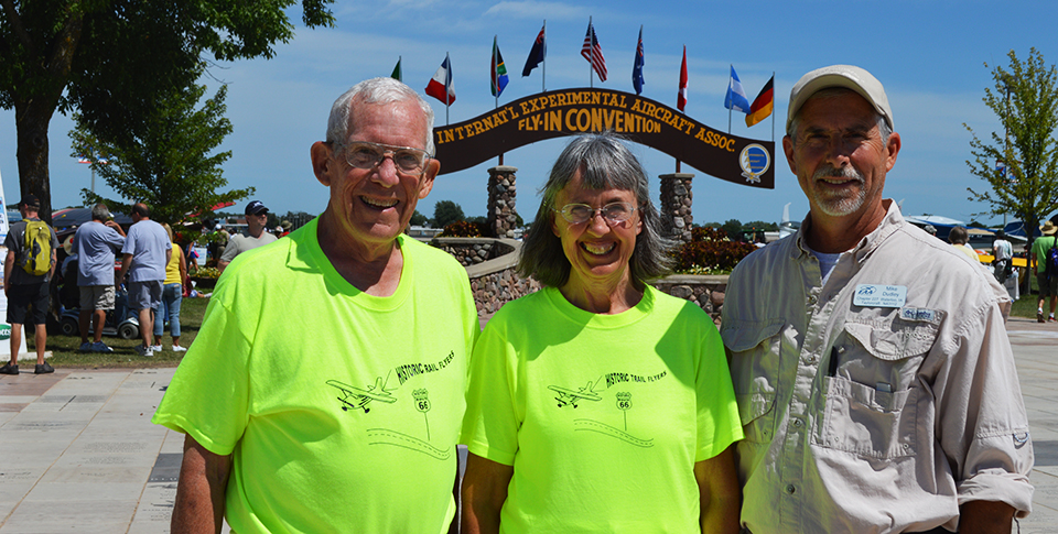 Wearing Historic Trail Flyers T-shirts at EAA AirVenture Oshkosh, group members are promoting their 2018 trip, which will be September 22 to October 1 and covers Albuquerque, New Mexico, to Victorville, California.