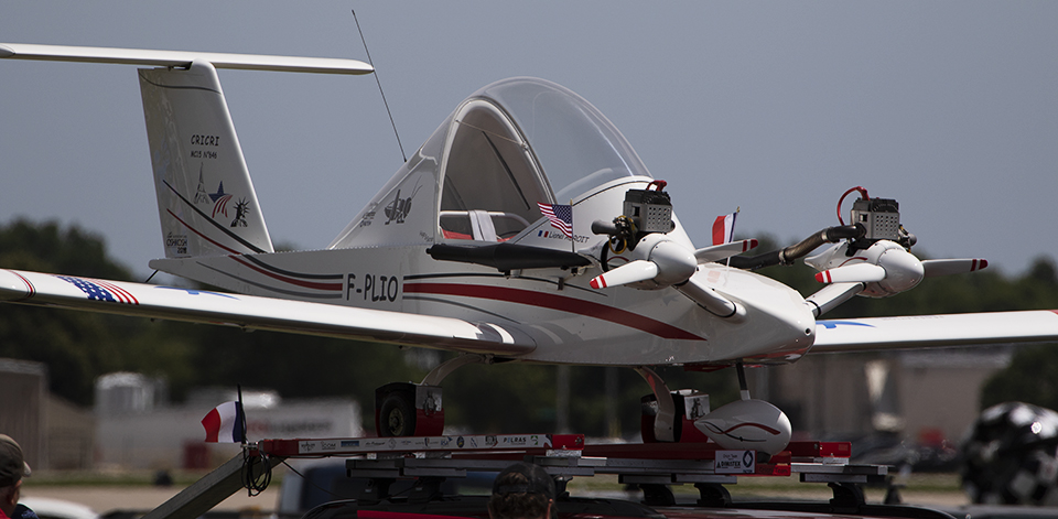The tiny twin-engine Cri-Cri homebuilt gets its name from designer Michel Colomban’s daughter’s nickname. The original plans call for a 12-foot, 10-inch length and a 16-foot, 1-inch wingspan. The Cri-Cri was brought from Toulouse, France, to Oshkosh via both road and sea transport.