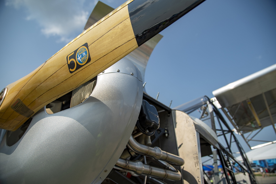 The 118-hp engine, custom built by Don's Green Machines, displaces 201 cubic inches, uses many certified aircraft engine parts, and bears a strong resemblance to what you will find under the hood of a Cessna 150. (When using certified aircraft components to build up an engine for experimental application, a certain nuance is required.) The engine will spin a custom Sensenich wooden propeller with the "50 Years of Oshkosh" logo.
