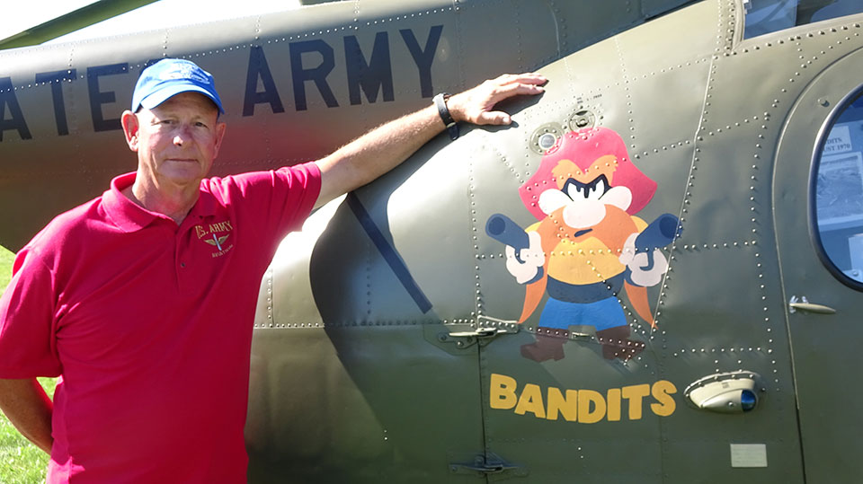 Peter’s helicopter flies primarily in air shows and veterans events, now. It was built in 1967 and served with the 3rd Squadron of the 11th Armored Cavalry. It was damaged in battle in Vietnam and shipped back to the United States for repairs before returning to the fray. It still carries a bullet patch on its chin today. Coincidentally, Peter flew OH-6s as a warrant officer pilot in the same unit in Vietnam from June 1970 to June 1971, but his overseas tenure and that of his OH-6 did not overlap. Peter’s combat experience in OH-6s included directing artillery with an armored cavalry spotter and a door gunner aboard.