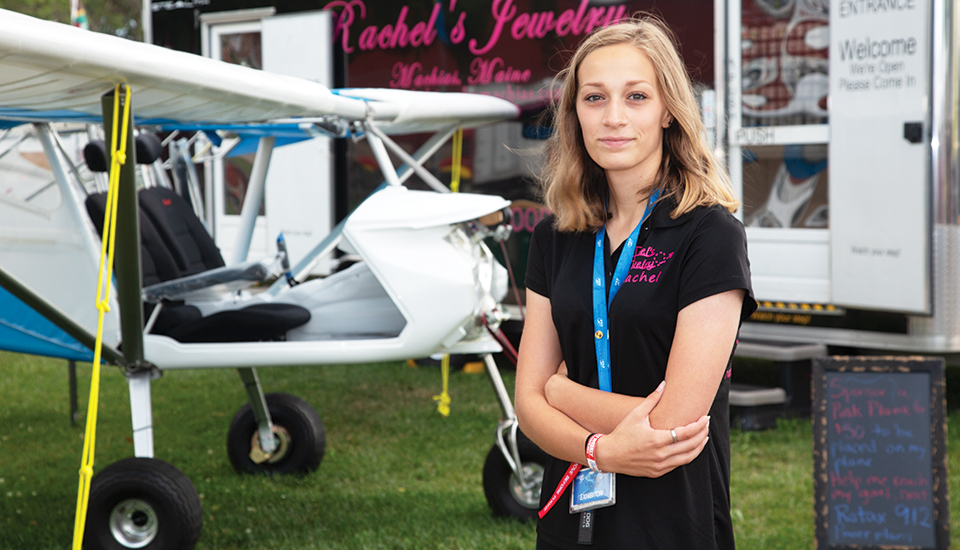 An in-progress SkyReach BushCat sits in front of the trailer that houses Rachel’s Jewelry. The business’s 16-year-old owner, Rachel St Louis, EAA 1161689, is in the process of building it using the proceeds earned from selling her jewelry.