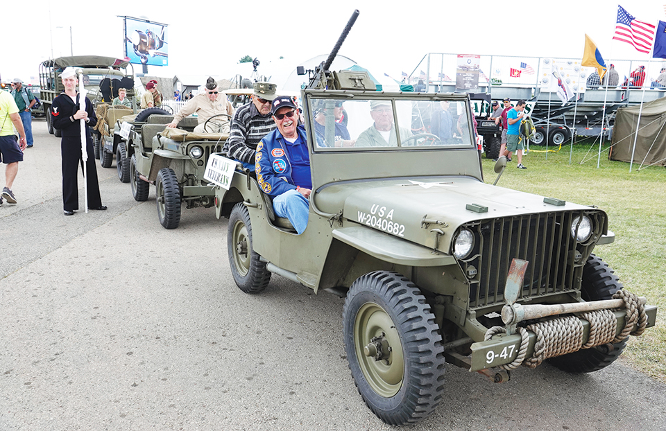 Some of the veterans walked the parade route; others rode a convoy of vintage military vehicles and golf carts commandeered for their use. Bernie Faust rode in a jeep with a U.S. Navy sign attached. “I’m a tin can sailor,” Bernie vouched. He served from 1949-57. “We used to do plane guard duty behind aircraft carriers. We called them ‘bird farms,’ he recalled. This is Bernie’s 44th AirVenture; he supports air show operations.