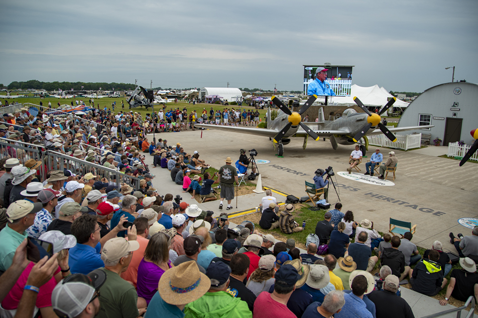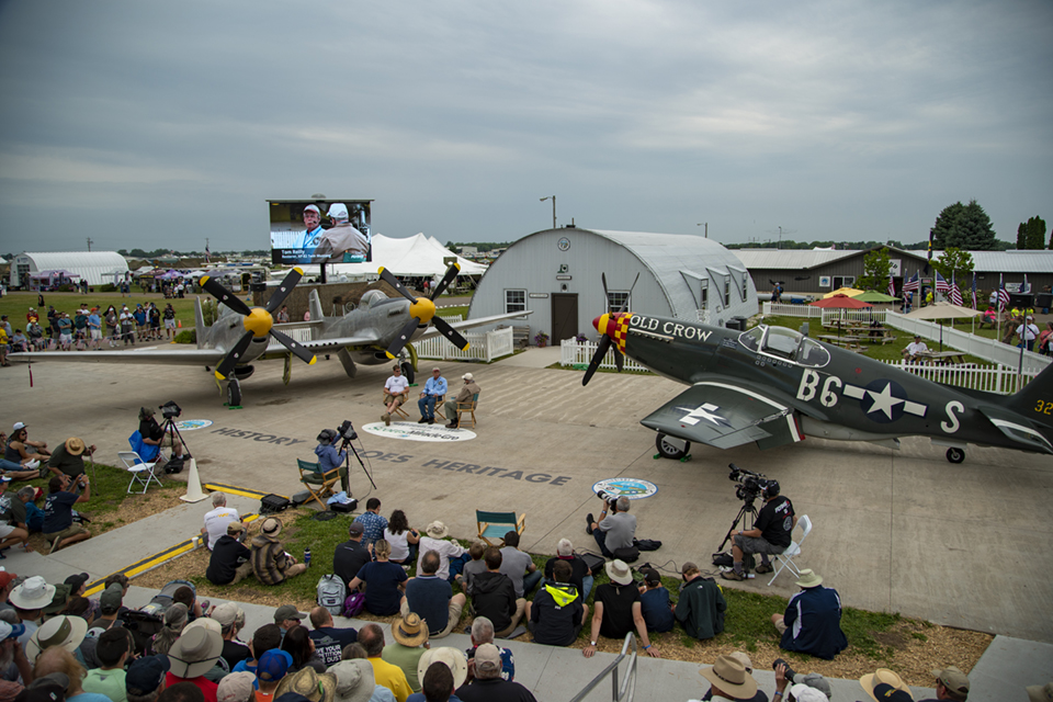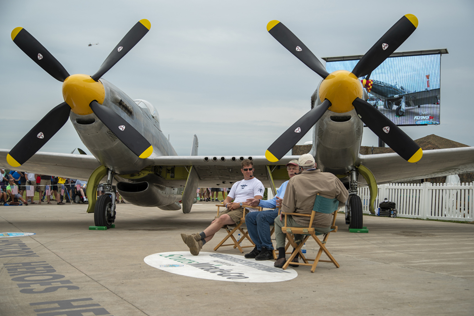 July 27, 2019 - The bleachers in Fightertown were packed, and the overflow was standing five deep for the Warbirds in Review presentation and interview of XP-82 owner and restorer Tom Reilly and pilot Ray Fowler. The crowd was gathered to hear the story of how the one and only flying Twin Mustang made it into the air and what it is like to fly.