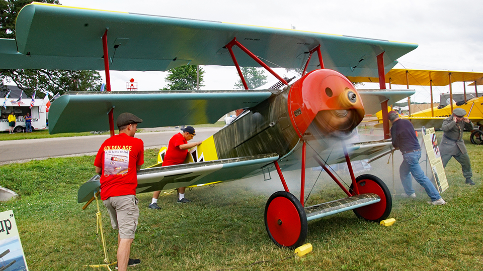 The Golden Age Air Museum of Bethel, Pennsylvania, trucked its well-scaled Fokker triplane and a modern-engined replica Sopwith Pup to AirVenture to participate. The museum crew needed about five hours to reassemble the Sopwith Pup for flight at Oshkosh. The Fokker triplane took half that, because Fokker used a design devoid of bracing wires.
