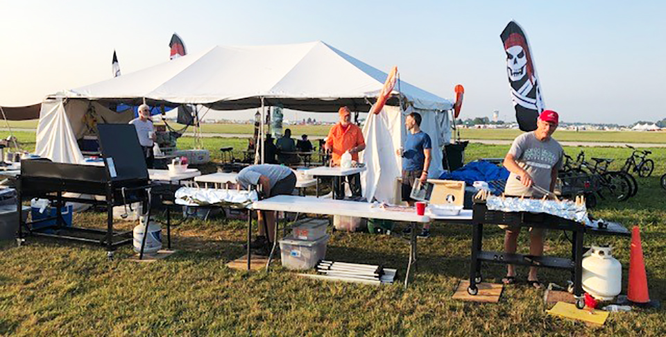 The Pirates of the North 40 sit on the flightline north of the runway, on the edge of the airport grounds. There are 50 campers this year and several dozen planes that are part of the group, said John Theune, EAA 9002774, of Severna Park, Maryland. On Tuesday morning bacon and French toast were on the menu, and pork for the evening luau.