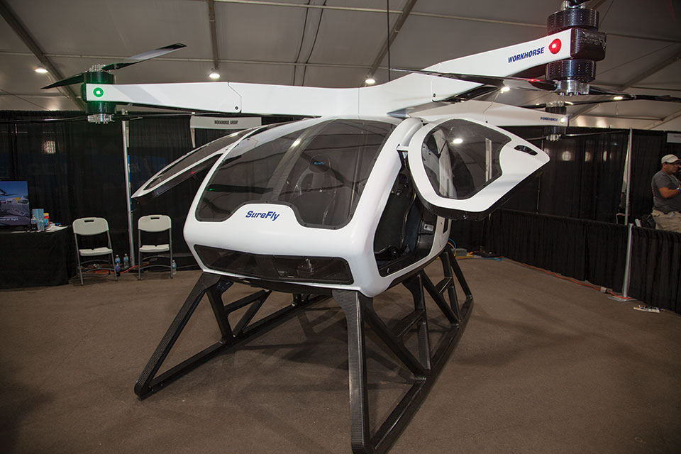 The SureFly, which made its U.S. debut here at AirVenture, is an in-development, electrically powered, two-place personal helicopter from Workhorse Group, an Ohio company primarily involved in electric propulsion for ground transportation. The SureFly’s four arms extending outward above the cabin each contain two motors driving counter-rotating propellers — one above, one below — at the end of each arm. Much easier to fly than a conventional helicopter, a joystick controls horizontal motion while a simple up and down button controls ascent and descent.