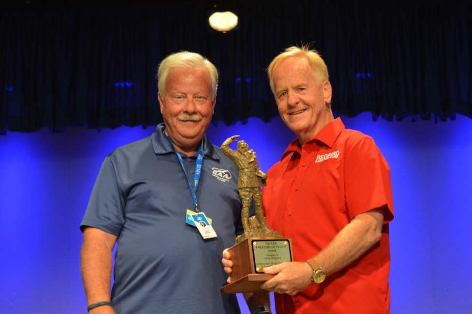 EAA’s Jack J. Pelton, left, presents the Freedom of Flight Award to Jerry Gregoire and Redbird.