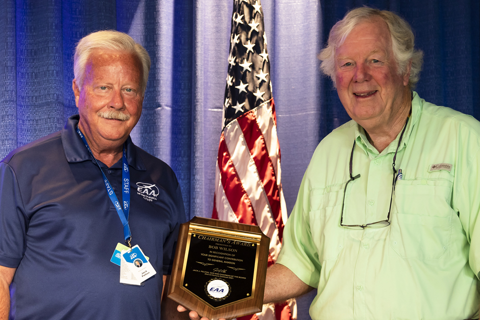 EAA CEO and Chairman of the Board Jack J. Pelton, left, presents the Chairman’s Award to Bob Wilson.