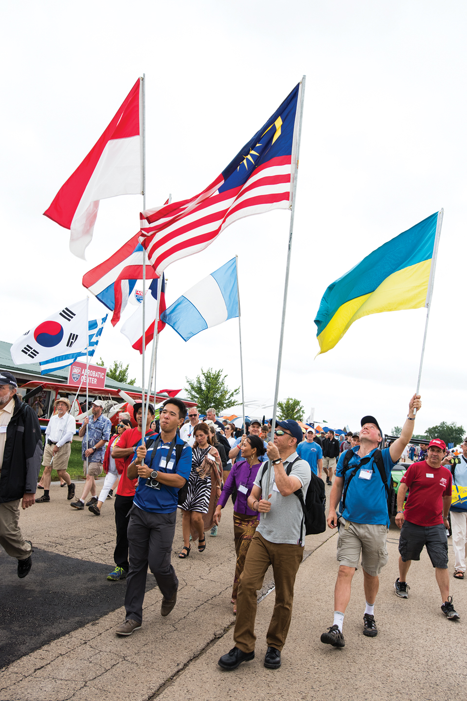 Visitors numbering in the hundreds from every continent except Antarctica took part in the EAA AirVenture Oshkosh 2016 annual Parade of Nations on Friday. Members of each nation’s contingent marched under their respective flags from the International Visitors Tent to the air show announcers’ area. More than 1,700 visitors have 70 countries have registered at the tent.