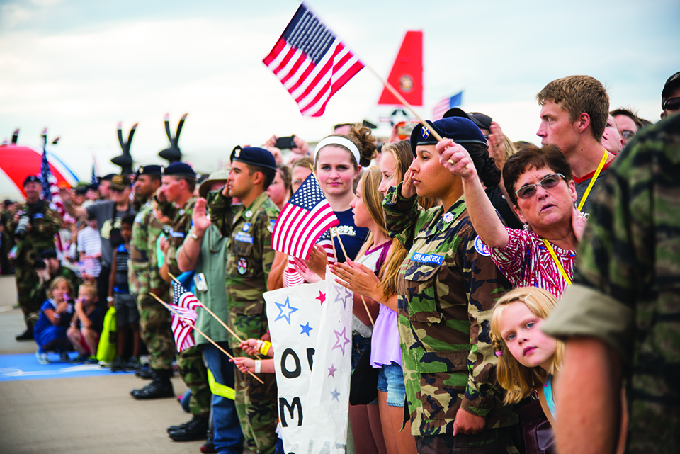 Families, friends, active duty and reserve military from all branches, and supporters lined a pathway leading from the tarmac to the Ford stage, where the vets were later treated to a concert. Holding up signs that welcomed home the heroes, and waving U.S. flags in the air, family and friends eagerly awaited the return of their loved ones.