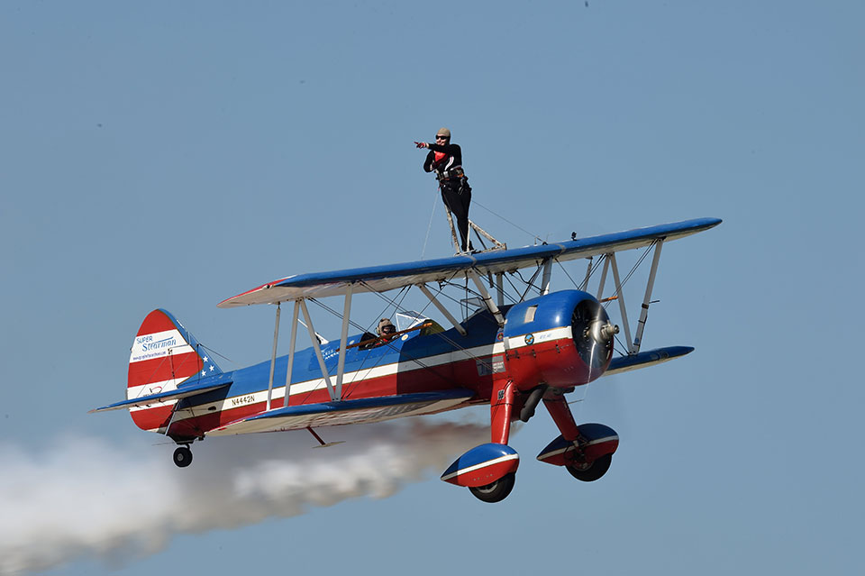 Day: Patriot Parachute Demo Team, Bill Stein (Edge 540), Matt Chapman (Extra 330LX), Kirby Chambliss (Edge 540), Greg Shelton and Ashley Key (450 Super Stearman/wing walking), International Aerobatic Club competition demo (Cameron Jaxheimer), Redline Airshows, Kyle Franklin (Piper Cub), Patty Wagstaff (Extra 300LX), Maj. Joshua Boudreaux (Wild Blue), Scott Yoak (P-51 Mustang), Mike Goulian (Extra 330SC), U.S.A.F. Heritage Flight (F-35, A-10, P-51), U.S. Navy Blue Angels (non-aerobatic demo) including Fat Albert