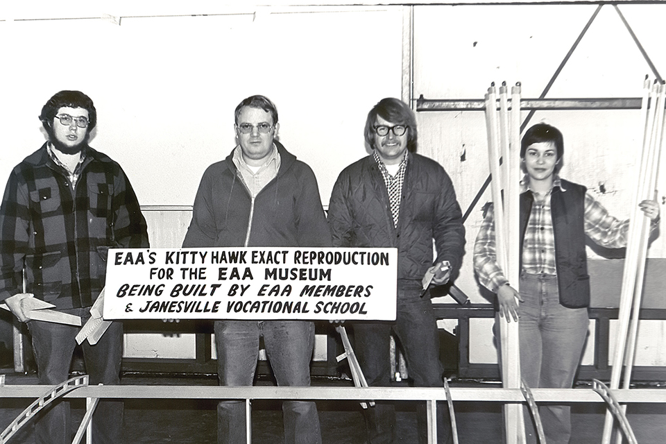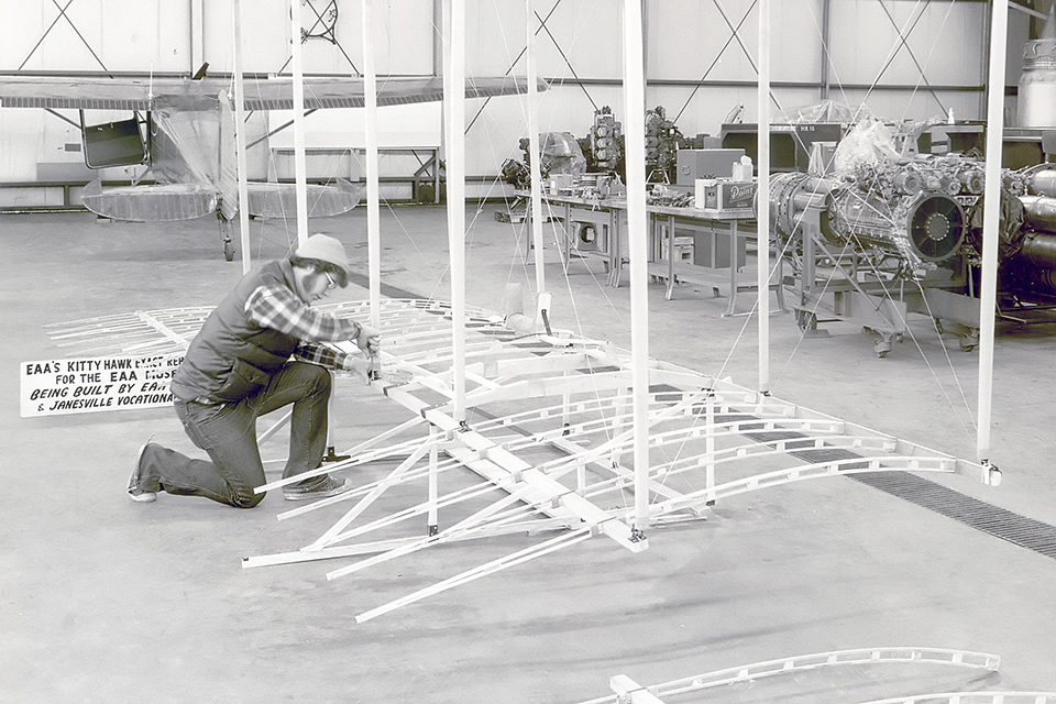 This replica was built jointly by EAA and Blackhawk Technical Institute of Janesville, Wisconsin, over a period of 10 years. Various components were built at Blackhawk, in the EAA shops, and by EAA volunteers around the United States. Final assembly and much of the detail work were carried out at Blackhawk by students in the aviation mechanics program. The replica was completed in 1978 — the 75th anniversary of the Wrights’ first flight — and was placed on permanent exhibit in EAA’s museum.