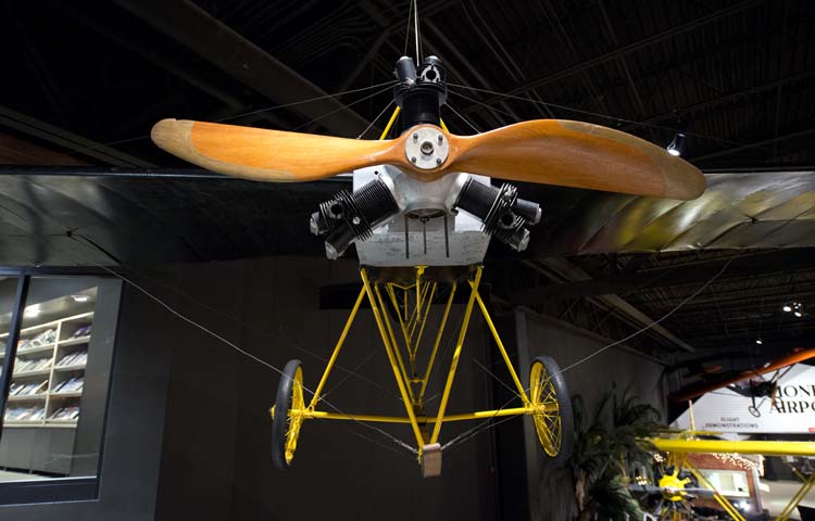 In 1911, he built a monoplane of original design, powered by a Bates 30-hp engine. The airplane in our museum collection is a redesign of that earlier aircraft. The Bates Monoplane is unusual in that the forward part of the fuselage is made of wood, while the structure aft of the cockpit is steel tubing. It has been described as a hybrid along the lines of the Nieuport, with a “pigeon-tail” empennage and a generous rudder. As displayed in the museum, the aircraft has a Poyer engine.