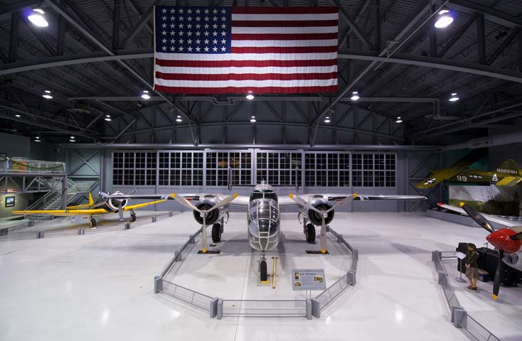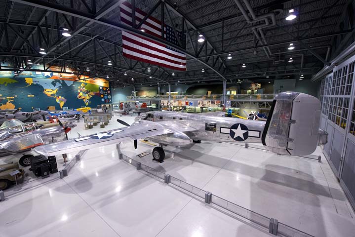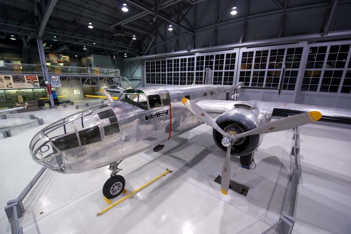 Widely regarded as the best medium-class bomber of World War II, the North American B-25 Mitchell served in all theaters of operation during the war. The B-25 was designed in 1939 by the North American Aviation Company, and was named in honor of Maj. Gen. William “Billy” Mitchell (1879-1936), one of the earliest and strongest advocates for American airpower. From 1940 to 1945, nearly 10,000 B-25s were built by North American, more than any other U.S. twin-engine bomber, at plants in Inglewood, California, and Kansas City, Kansas.