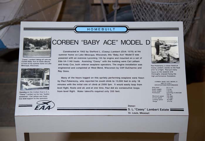 When Lambert died, his estate donated the Baby Ace on floats to EAA. The Box Full Baby Ace has been on display in the EAA Aviation Museum ever since.