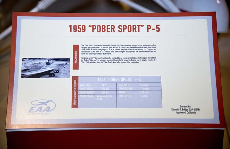 After the cross-country tour, the Pober Sport was displayed in the EAA museum for a short time before it was sold to California residents George Walrath and Ken Bride. The airplane was returned to the EAA Museum early in 1976 and remains on display to date.The Pober Sport was initially powered by a Continental A-80 engine, which was swapped with a Continental C-85 when the airplane made the trip to California to meet its new owners.