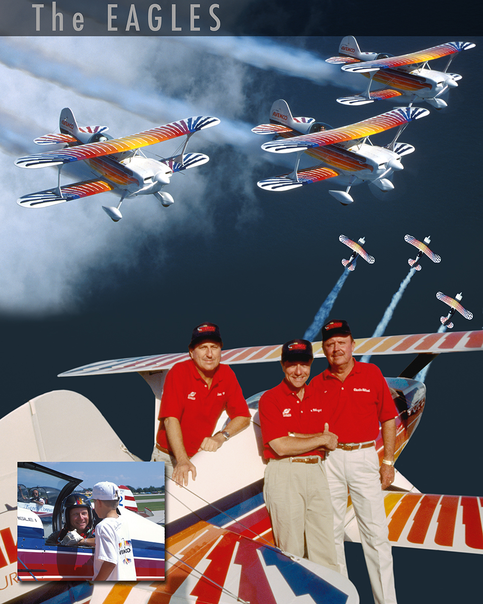 The Eagles Aerobatic Team’s airplanes now hang in the EAA Aviation Museum lobby. Hillard, Poberezny, and Soucy flew the Eagles in aerobatic performances from 1979 until 1995. At the close of their farewell performance during EAA Oshkosh 1995, they had been flying together for 25 years (including their time as the Red Devils), longer than any other team in aerobatic history.