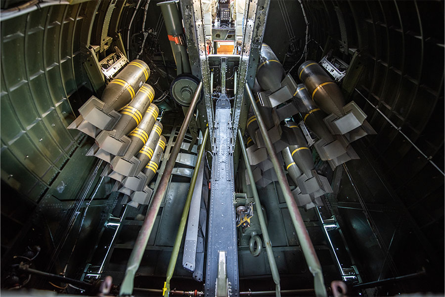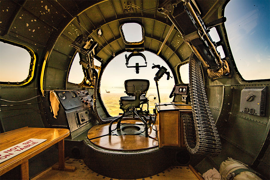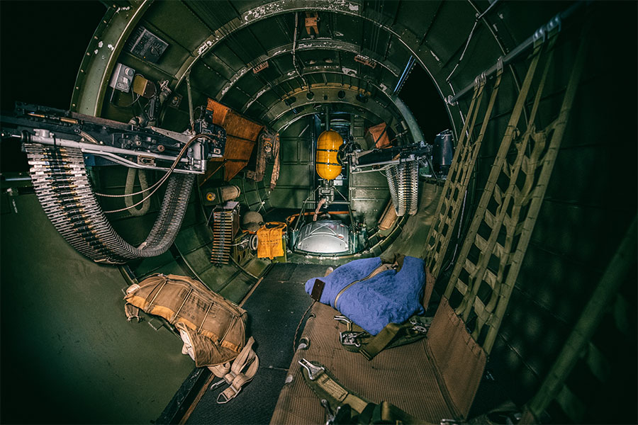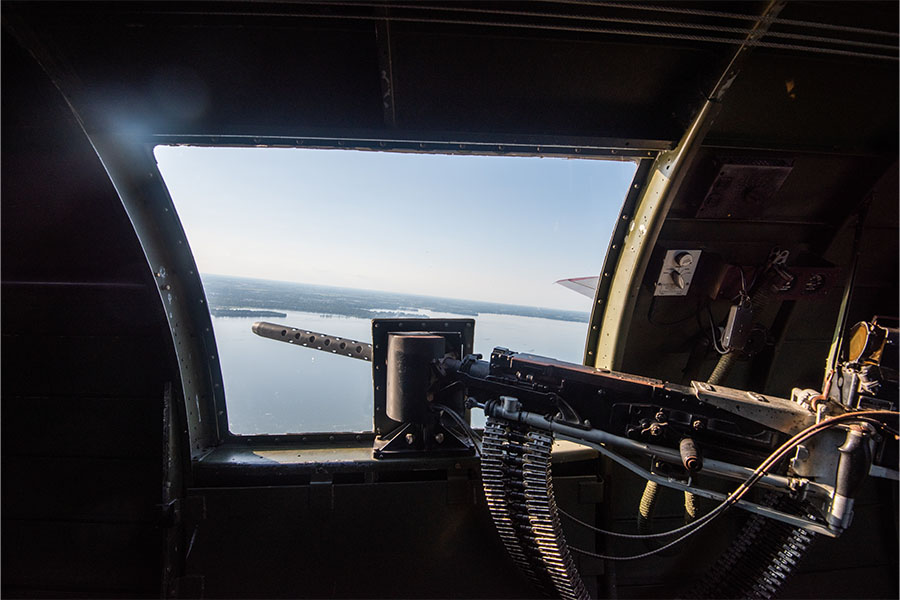 Guns: 13 × .50 inches (12.7 mm) M2 Browning machine guns in 9 positions (two in the Bendix chin turret, two on nose cheeks, two staggered waist guns, two in upper Sperry turret, two in Sperry ball turret in belly, two in the tail, and one firing upwards from radio compartment behind bomb bay)