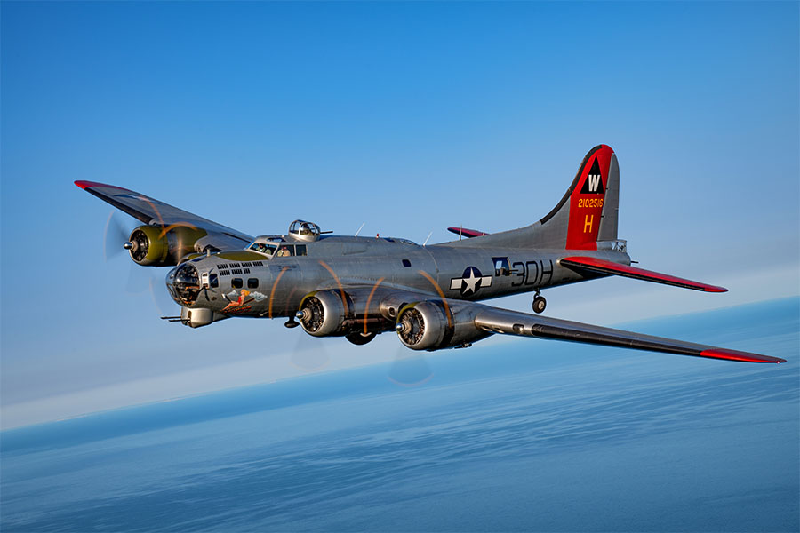 Aluminum Overcast proudly carries the colors of the 398th Bomb Group of World War II, which flew hundreds of missions over Nazi-held territory during the war. Aluminum Overcast commemorates B-17G 42-102516 which was shot down on its 34th combat mission over Le Manior, France, on August 13, 1944. Veterans of the 398th helped finance the bomber's restoration.
