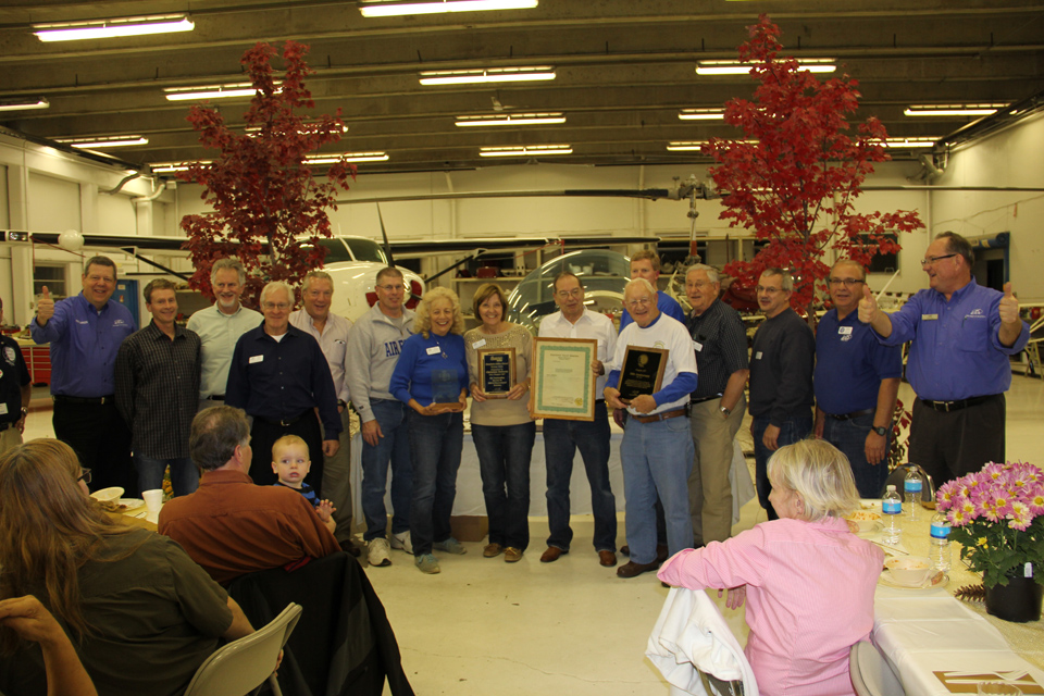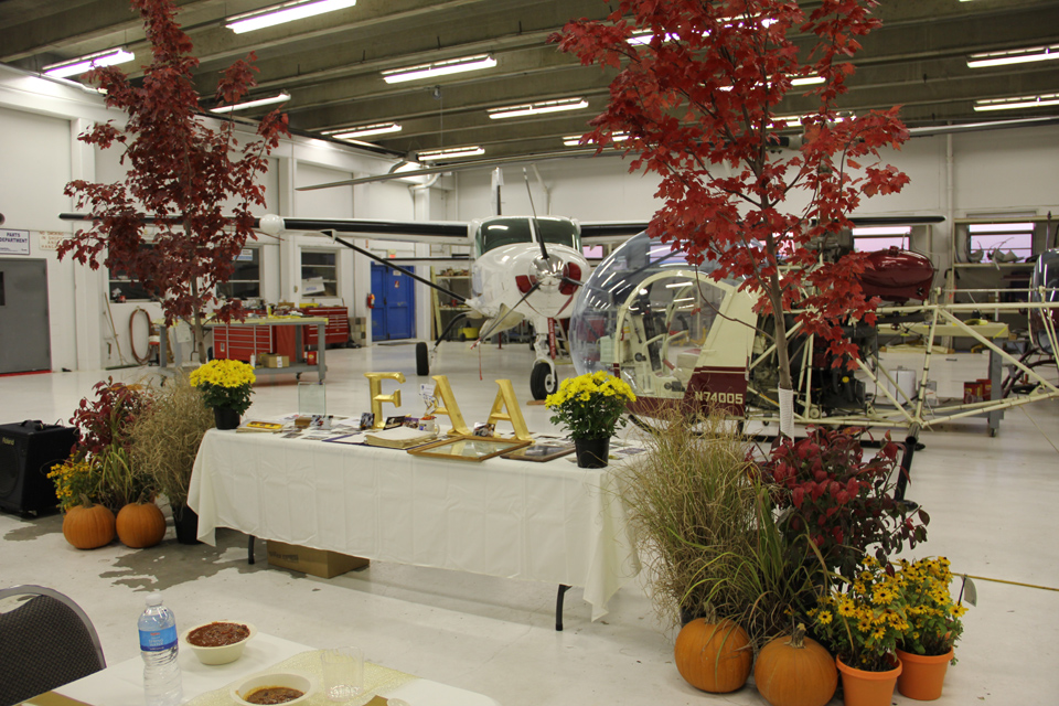 November 2015- What better way to celebrate the 50th anniversary of Chapter 227 than in the huge Livingston hangar with Richard Shepherd’s glorious fall displays! About 70 people joined the fun and brought delicious food to share. The personal stories from our chapter’s early days were so touching, they brought a tear to the eye. In addition, an EAA delegation from Oshkosh flew in just to celebrate our special evening.