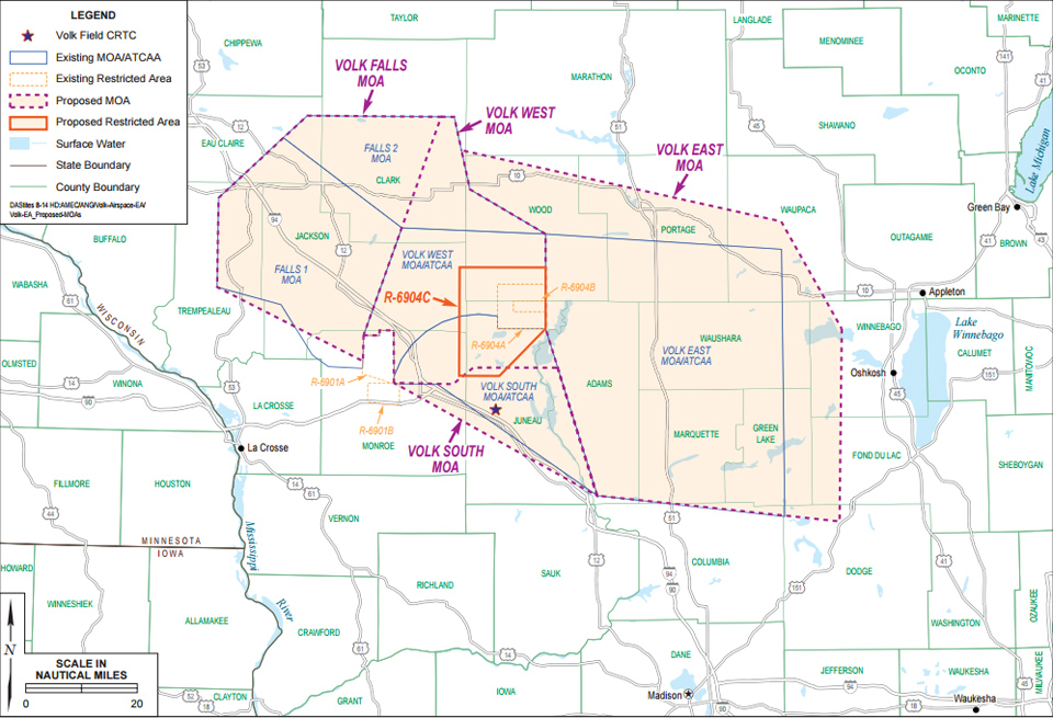 January 28, 2016 - This month, the National Guard Bureau released a draft Environmental Assessment (EA) on the proposed expansion of multiple military operations areas (MOAs) and the addition of a restricted area in central Wisconsin. The expanded MOAs and restricted area support training activities hosted by the Volk Field Combat Readiness Training Center (CRTC). The EA only addresses the environmental impacts of the proposed changes and does not cover impacts to general aviation operations in the area.
