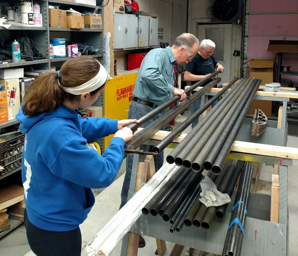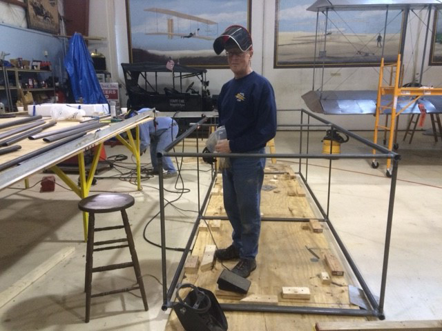 Construction at the Wright B Flyer hangar has started by organization volunteers and EAA Chapter 382 members. The tail boom is the first major component being built in Dayton. The tail boom is mostly welded steel tube construction. When the tail boom is finished it will be used in ground testing of the rudder.