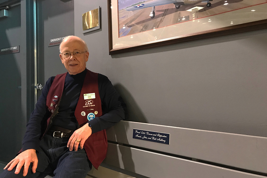 After Bill died in April 2017, John felt that the EAA Aviation Museum would be a great place for some of his items. A bench in the Eagle Hangar was dedicated in his name and that of the Mellberg family.
