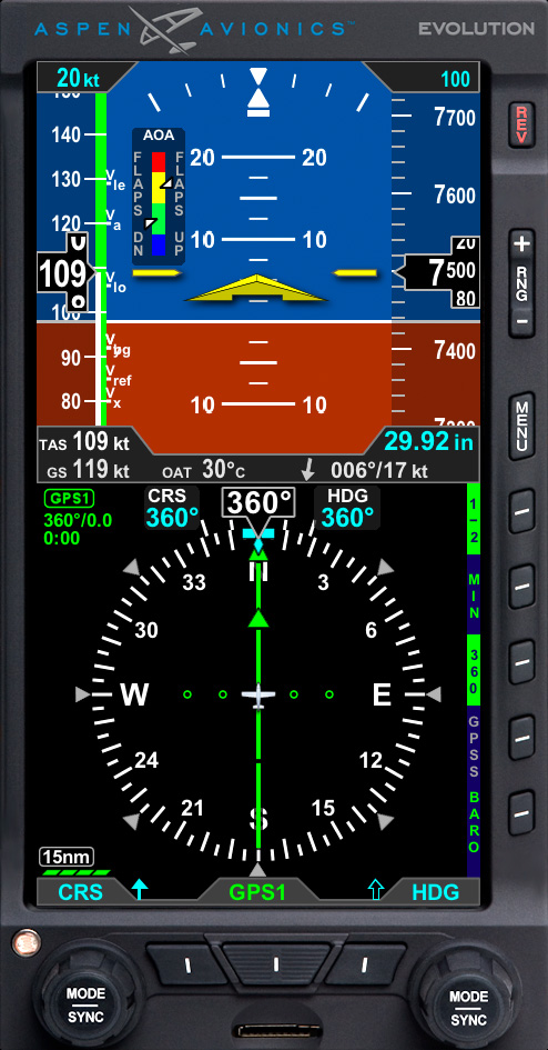 Aspen’s Evolution AOA indicator calculates angle of attack from the flight envelope data received from the air data computer and AHRS in the Evolution 1000 PFD/1000 MFD, and a certified GPS. Therefore it does not require additional hardware, external aircraft modifications, or sensors.