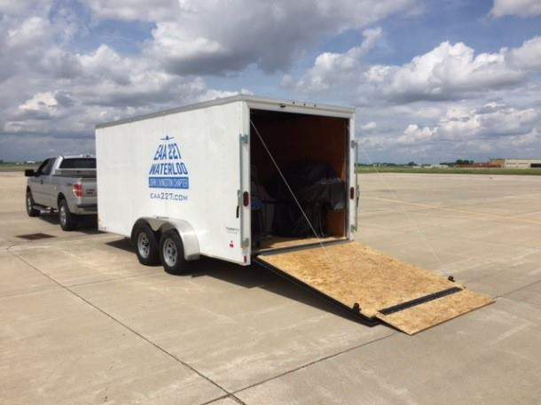 With the proceeds of hosting a B-17 Aluminum Overcast tour stop, Chapter 227 recently purchased an enclosed trailer to address this challenging process. It’s 7 feet by 16 feet, equipped with a ramp entry at the back and a door on the right side. Outfitting the interior is still a work in progress, but at this point, there’s a bin in the front for stanchions with a large shelf on top, slotted rails with straps on both sides to tie down two folding chair dollies, tables, and grill. The chapter logo was added to the sides and rear of the trailer to dress it up and advertise EAA and the chapter. It was put to work right away to haul equipment for a chapter picnic and made unloading easy and efficient!