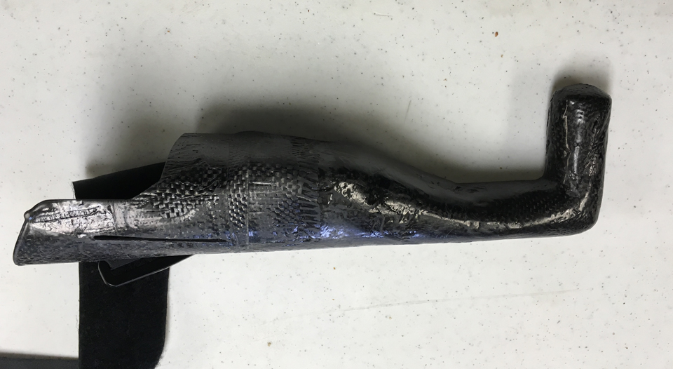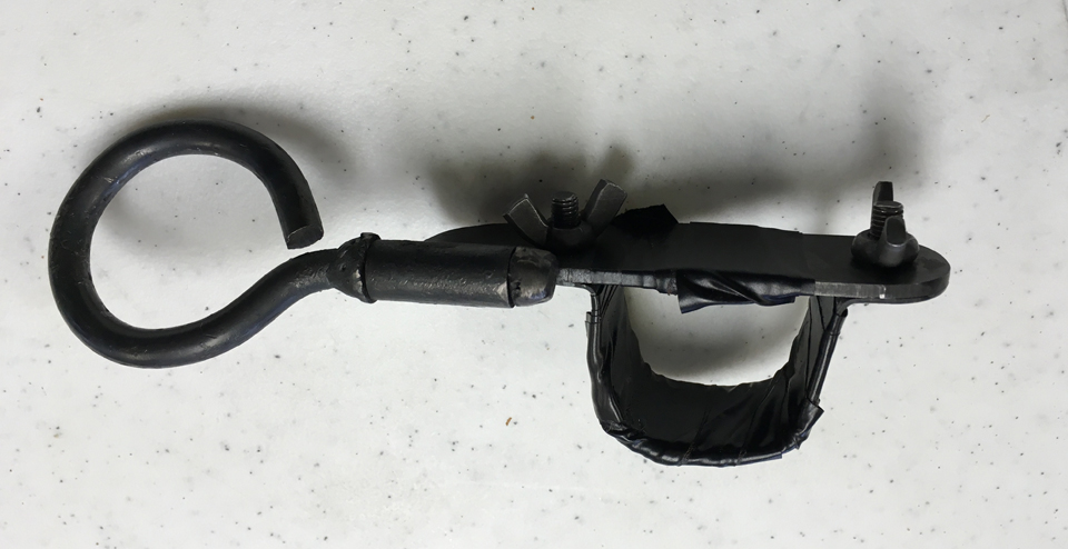 I made the prosthetic out of carbon fiber scraps I had in my workshop. I carved foam into the desired shape, applied the carbon fiber/epoxy to the outside of the form, and removed the foam once cured. This was sanded smooth and any sharp edges were removed. This left a socket in one end that could receive his arm. Slits were cut for the strap, which is a length of Velcro that I bought from Home Depot. The strap wraps around his upper arm, securing the prosthetic. The eye was bent from 1/4-inch steel rod. The straight end of the eye was passed through a short length of 1/4 inch bushing stock and secured in place by welding washers to the rod on either end of the bushing, thus allowing the eye to freely turn in the bushing. This bushing was first welded to a length of 0.09-inch-thick 4130 sheet, which became the bracket that clamped the whole interface to the control yoke.