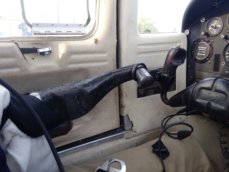 The result is that Chad can control the airplane by using his left arm to operate the elevators and ailerons and his right hand to operate the engine controls, flaps, trim, instruments, and avionics. He underwent a medical flight test given by the local FSDO, received a statement of demonstrated ability, and recently soloed.