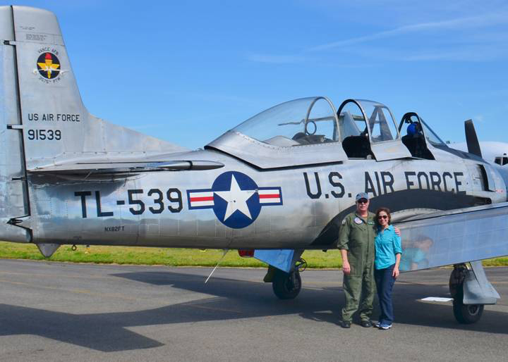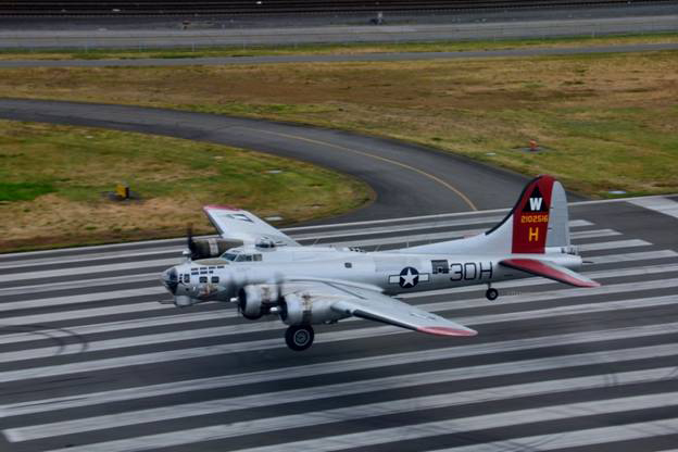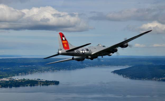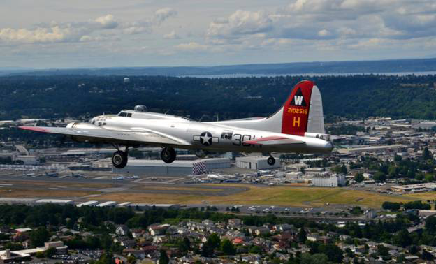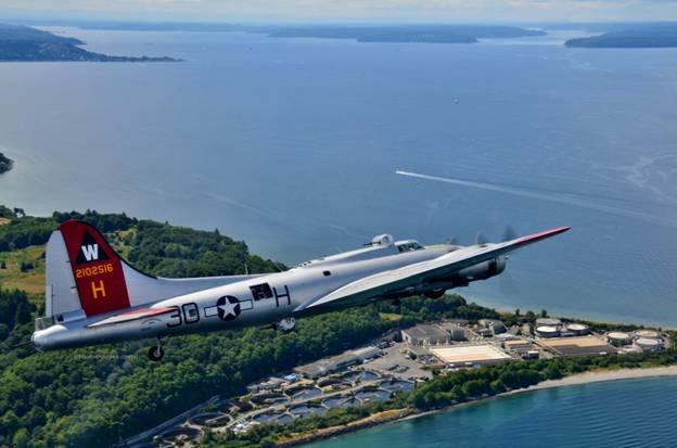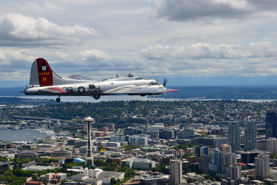 June 23, 2016 - Pinch me! Did this really happen? Was it a dream? Good thing I have photos to prove it! As an aerial photographer, I thought joining the Cascade Warbirds in Seattle would be an interesting experience, but never thought it would lead to getting once in a lifetime opportunity to get images I've only seen in magazines. The images here are a result of flying with Ron Morrell, commander of EAA Warbirds Squadron No. 2, the largest squadron. In his cherried-out T-28 Trojan, Morrell was my "chase pilot." We met at Paine Field to fly out then climbed into the cockpit, started up, and BOOM! POOF! Big cloud of black smoke (ah the smell of avgas in the morning!) and the engine hummed like a well-oiled machine. We left Paine Field to join up as the B-17 left Boeing Field and followed (at a very safe distance). We transitioned over Lake Washington and the longest floating bridge from the Eastside, over the University of Washington, Lake Union, and on into Seattle.
