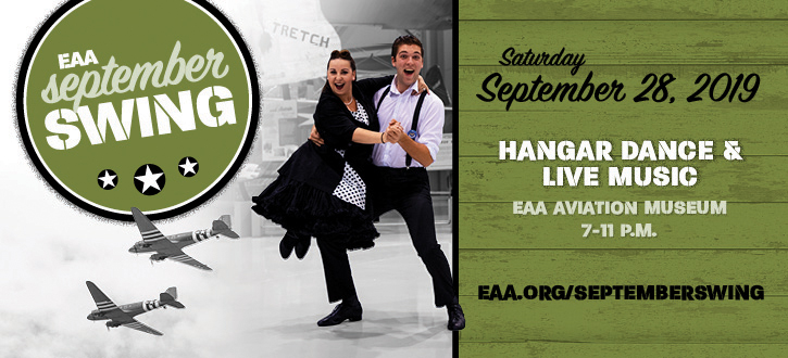 August 8, 2019 - The annual hangar dance September Swing is back again. Join us in the EAA Aviation Museum's Eagle Hangar on September 28 for a night of dancing, socializing, and live music. Surrounded by World War II era aircraft and vehicles, there is no backdrop more fitting for this 1940s throwback event. The event will also commemorate the 75th anniversary of D-Day in conjunction with the museum's newest exhibit, D-Day Plus 75 featured in the Telling Gallery.