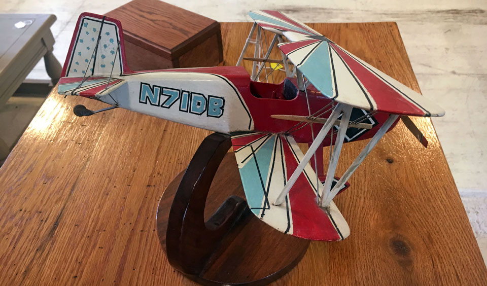 August 17, 2016 - On July 2, 2016, I was browsing through an antique store in Lawrenceburg, Tennessee, when I spotted a model airplane. It caught my attention for several reasons. First, anything aviation related gets my attention – especially in an antique store (ask my wife). Second, it was obviously a handmade model. Third, it was not a “common” biplane like a Stearman, Pitts, or Christen Eagle, but a side-by-side homebuilt biplane. And lastly, it had an N-number.