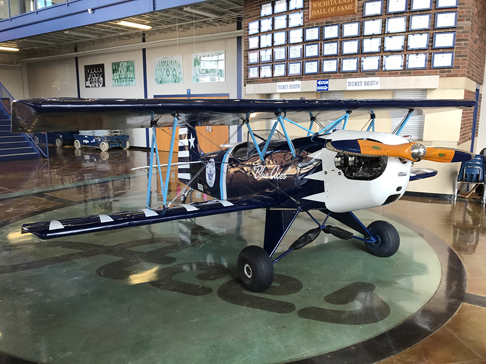 August 17, 2017 - Wichita East High School picked the Blue Aces as a mascot to commemorate World War I fighter pilots, but until recently there was no actual airplane there. The high school is set to unveil a restored, homebuilt biplane and to suspend it from the gym ceiling to help signify the Blue Aces history and significance in a ceremony on Thursday night.