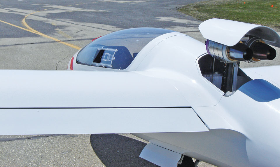 The turbines are compact in size (5.25 inches by 14.5 inches) and lightweight. The installation has less complexity than a piston engine with a prop and folding mast mechanism. One great advantage with this installation is that it has little effect on the aircraft’s center of gravity and pitching moment. A homebuilt composite 7-gallon fuselage header fuel tank filled with Jet-A, kerosene, or gas station diesel mixed with 5 percent turbine oil provides enough fuel for a self-launch and climb to 3,000 feet AGL. This quantity also provides enough fuel remaining for 25 minutes of sustained flight, with the use of one engine at reduced throttle settings. Each wing is constructed with a 3.5-gallon fuel cell for another 7 gallons of capacity if needed. The engines lack complexity, have few moving parts, and are virtually vibration-free. So far they have proven to be reliable and easy to start. Extending the engines has a similar drag frontal area as the retractable landing gear. This is quite different than a conventional auxiliary-powered sailplane folding mast with its piston engine and propeller.