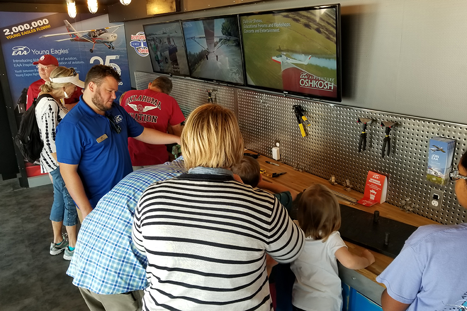 September 14, 2017 - With great weather and robust attendance, EAA participated in the latest AOPA fly-in held in Norman, Oklahoma, last weekend. EAA’s immersive Spirit of Aviation Mobile Experience — positioned as part of the static aircraft display — was a big hit with attendees and more than 1,000 people made their way through the vehicle during the two-day event. Visitors experienced virtual reality displays, sheet metal crafts, flight simulators, and glider building activities. A new NATCA air traffic control simulator was also quite popular. Thank you to EAA staff and volunteers were on hand to greet and assist guests and their families.