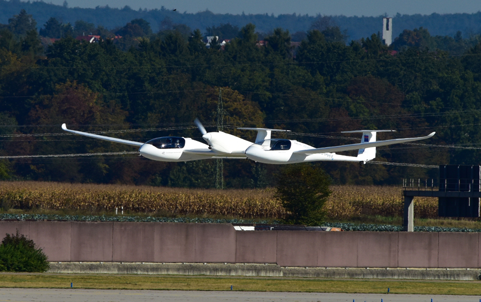 The DLR researchers developed the Hydrogenics hydrogen fuel cell powertrain and installed it in the aircraft. The aircraft was built by the Slovenian airplane manufacturer Pipistrel, and consists of two Pipistrel Taurus G4 motorglider fuselages connected by a common central-wing section on top of which the propulsion unit is located. This consists of an approximately 104-hp electric motor with the propeller in front and three low-temperature hydrogen fuel cells behind. The hydrogen is carried in two high-pressure tanks made of carbon fiber, located in each of the two fuselages just aft of the passenger cabin. The auxiliary battery pack is located aft of those hydrogen tanks just behind the occupants.