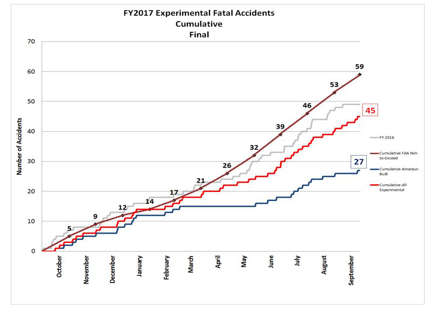October 12, 2017 - In September, EAA completed its annual tracking of experimental category fatal accidents. Experimental aircraft were involved in 45 fatal accidents during fiscal year 2017, with amateur-built aircraft accounting for roughly two-thirds of those accidents. As in previous years, the FAA established a “not-to- exceed” number based on a one percent reduction in accidents from the previous three-year average. The number of fatal accidents for fiscal year 2017 came in well below the not to exceed number of 59. Additionally, experimental fatal accidents saw a decrease of eight percent over fiscal year 2016 data. The numbers follow a downward trend of fatal accidents in both experimental aircraft and general aviation has a whole.
