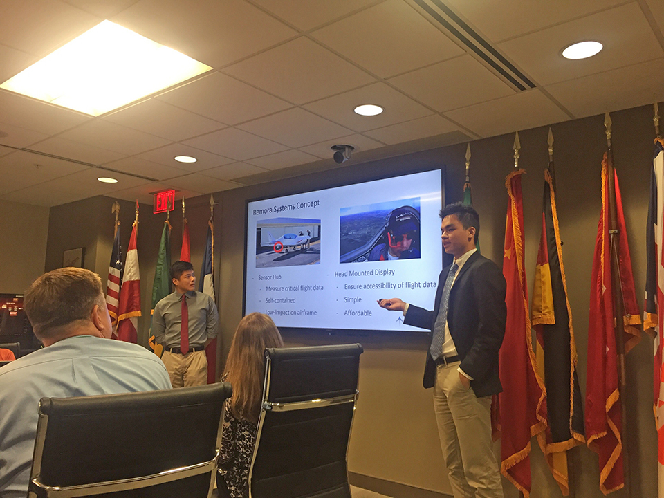 October 26, 2017 - Two members of the three-person team that took away first place and $25,000 in EAA’s 2017 Founder’s Innovation Prize presented their winning solution to the General Aviation Joint Steering Committee (GAJSC) in Washington, D.C., Monday. Thomas Baron, Maxwell Lord, and Justin Zhou won this year’s prize with their “Remora System” concept, which delivers critical flight information to the pilot through a head-mounted display. Baron and Zhou wowed the group of senior FAA officials and representatives of GA organizations who meet regularly to discuss GA safety metrics and accident prevention strategies.